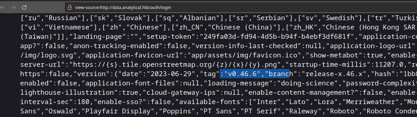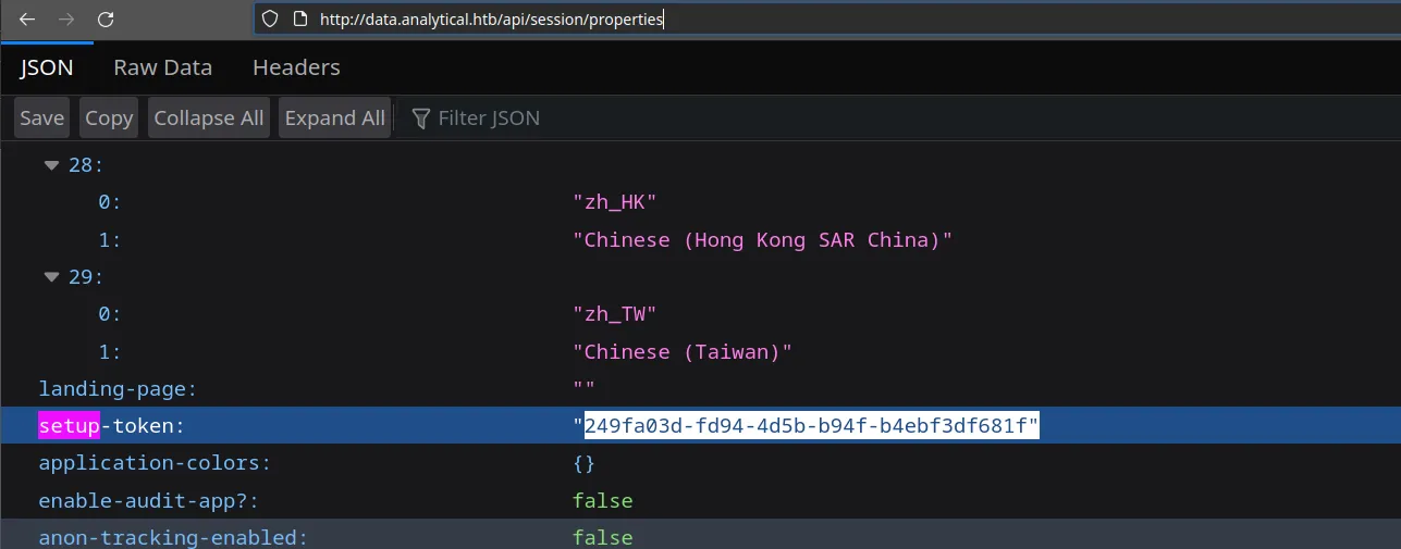 So a bit of google afterward and i found this post which describes how this vulnerability works, so first access http://data.analytical.htb/api/session/properties to grab the setup token. And the setup-token is 249fa03d-fd94-4d5b-b94f-b4ebf3df681f