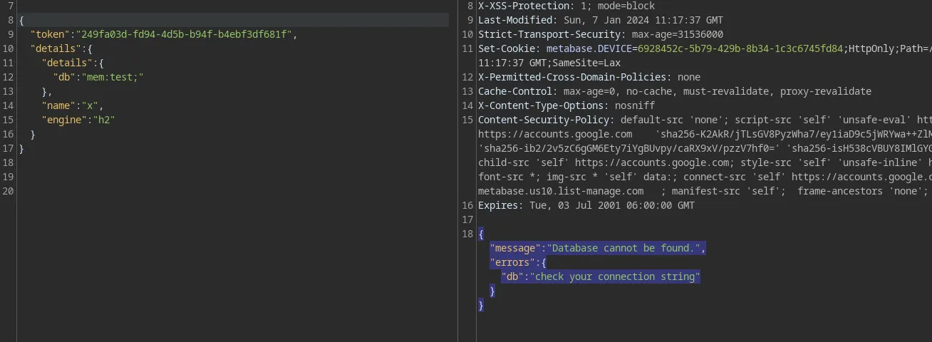 Then try to make a POST request to /api/setup/validate with the following content and yep, it does seem like we can provide a custom database for Metabase to connect to, which proves that this application is indeed vulnerable