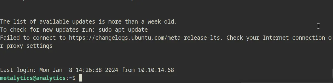 So i found a username and password called metalytics and An4lytics_ds20223# which i thought “Maybe this is the SSH credentials” and Bingo! it is…
